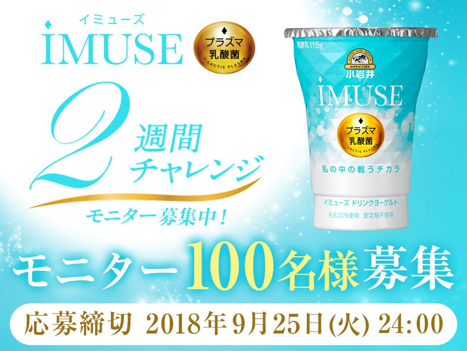 「小岩井 iMUSE(イミューズ)ドリンクヨーグルト」を2週間飲んで、その体験を写真つきでご自身のSNS(TwitterもしくはInstagram)に投稿してくださるモニターを100名様募集いたします。