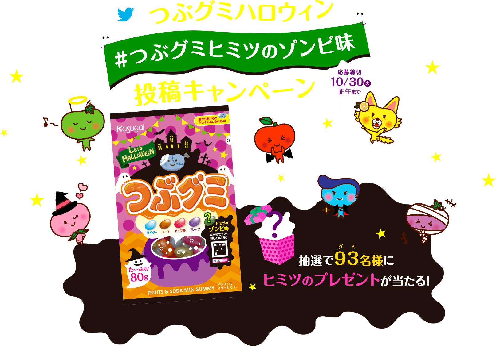 2018/09/26 apricot-manager ■ 応募サイト:春日井製菓 ■ 締切日:2018年10月30日 ■ 抽選で93名様 つぶグミヒミツを抽選で93名様にプレゼントいたします。 QUOカード500円分 ※当選者のうち、ゾンビ味の内容を正解した方に限る。 応募はこちらから