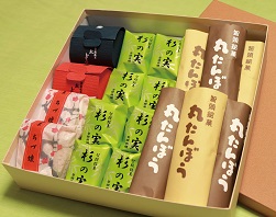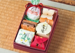 深いうま味の白あんが印象的な「杉の実」や「丸たんぼう」をはじめ、最高級の栗を包み込んだ「紅どうだん」、梅の実が丸ごと入った「ちづ娘」を詰め合わせた、和菓子のセット。