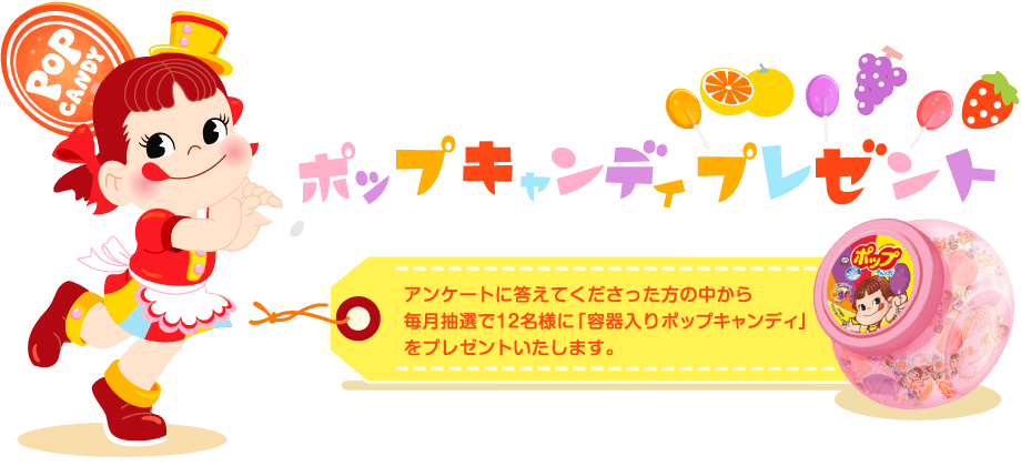 容器入りポップキャンディ1個(約76本入り) を抽選で12名様にプレゼントいたします。