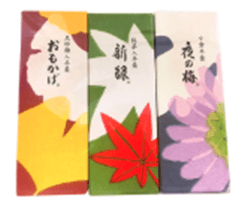 室町後期創業のとらや「小形羊羹」の秋パッケージ(夜の梅、おもかげ、新緑)。菊、いちょう、もみじをあしらった季節限定のパッケージです。