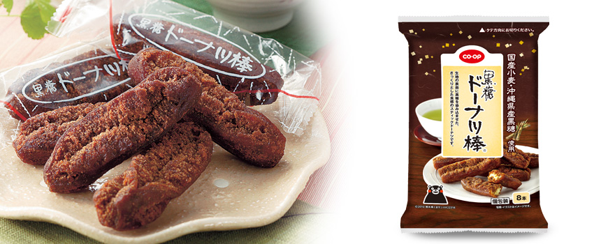 生地表面に黒糖を染み込ませたまろやか味のさっくりスティックドーナツです。国産小麦、沖縄産黒糖使用。