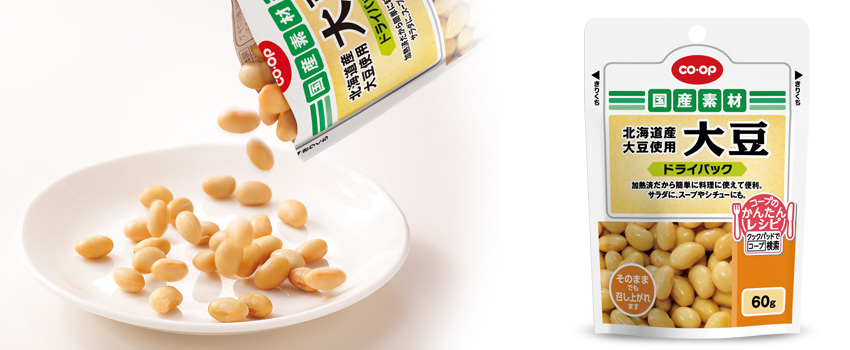 北海道産大豆使用。液を注入しないドライパックだから、ほっくりとした歯ごたえ。そのままでもおいしく食べられます。