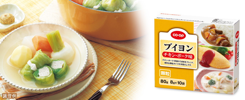 チキン、ポーク、野菜のうまみをバランスよく整えた洋風ブイヨンベースです。使いやすい顆粒タイプ。煮込料理、スープ、炒めものなどにどうぞ。