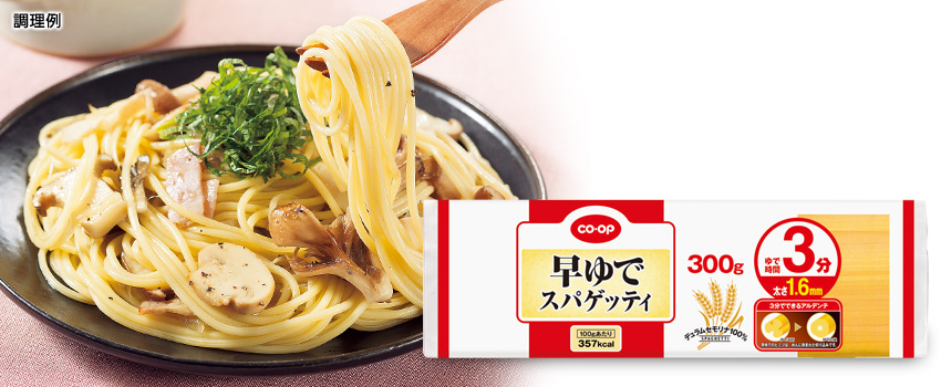 デュラム小麦を100%使用。スパゲッティの断面を三つ葉形にすることで、3分でしっかりとしたアルデンテ食感を実現しました。