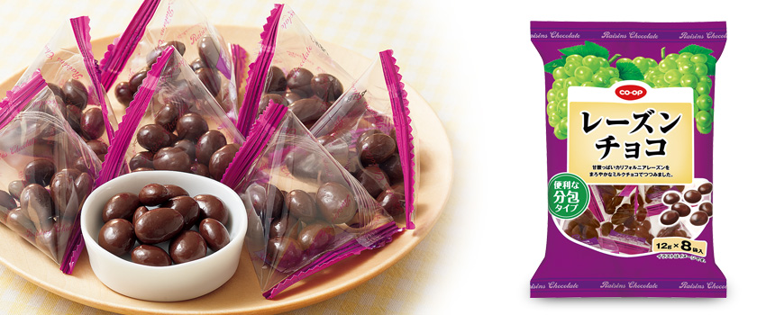 カリフォルニア州産レーズンをまろやかなミルクチョコでつつみました。便利な分包タイプ。おやつはもちろん、お酒のおつまみにもどうぞ。