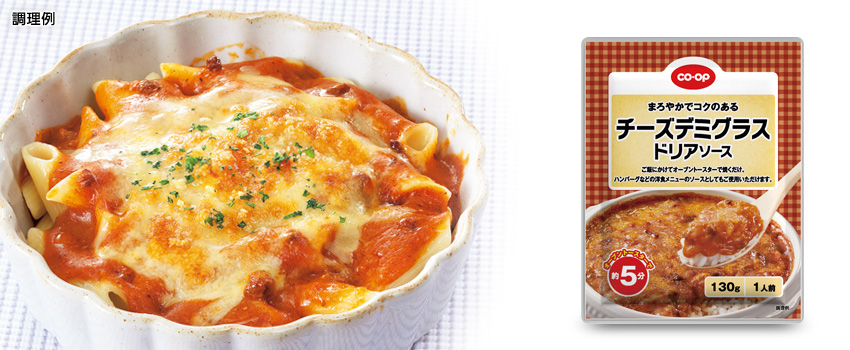 ご飯にソースをかけオーブン、オーブントースターで調理するドリアソースです。デミグラスソースにチーズを加え、まろやかでコクのある味に仕上げました。