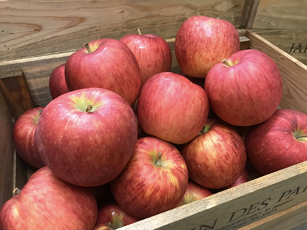 りんごの王様として名高い「ふじ」。「国光」と「デリシャス」の交配品種で、日本を代表するりんごです。多汁で甘味が強く、蜜も入りやすく、貯蔵性に優れています。