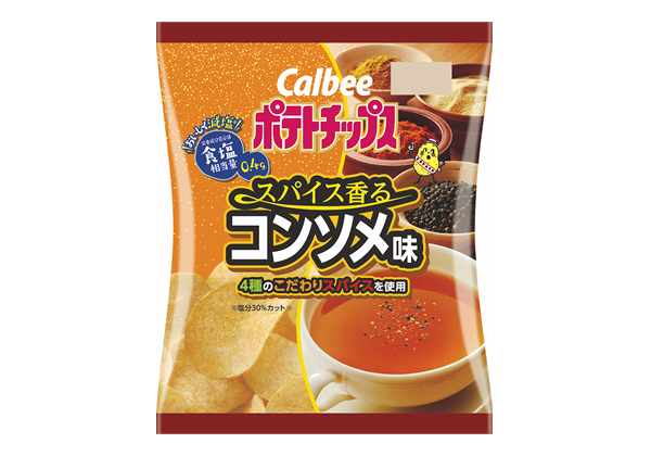 「スパイス香るコンソメ味」は、チキンやビーフなどの肉と野菜の旨みが効いたコク深いコンソメスープに、4種のスパイス(唐辛子、ブラックペッパー、カレーパウダー、ガーリック)をプラスしたピリ辛味のポテトチップス。