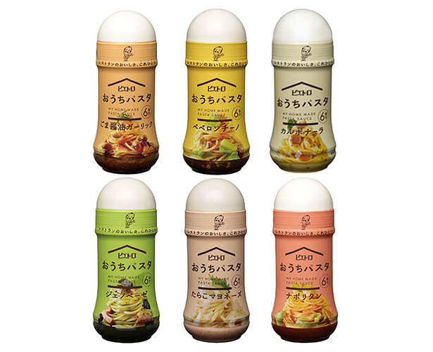 ゆでたパスタにまぜるだけの簡単&おいしい液状パスタソース「おうちパスタごま醤油ガーリック」、洋麺屋ピエトロの名物メニューでシェフのこだわりたっぷりのレトルトパスタソース「絶望スパゲティ」、ドレッシング「レモンとたまねぎ」。