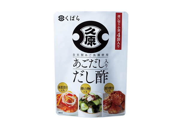 「あごだし入りだし酢」は、自社製あご魚醤、かつお節、焼きあごだしなど魚介のおいしさをベースに、国産のすだち果汁やりんご酢を加えた、さっぱりとしつつも旨みのあるだし酢です。