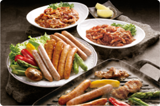 国産豚肉をコクのある醤油ベースのタレで味付けしたポーク焼肉と、プレーン・ハーブ・ガーリックの3種類のソーセージをセット