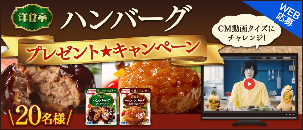 CM動画を見てクイズに答えて応募しよう!「洋食亭®」ハンバーグ2種類を2袋ずつセットにして20名様にプレゼント!