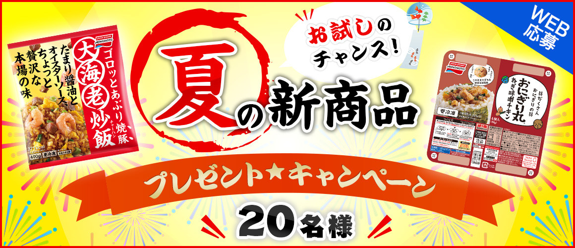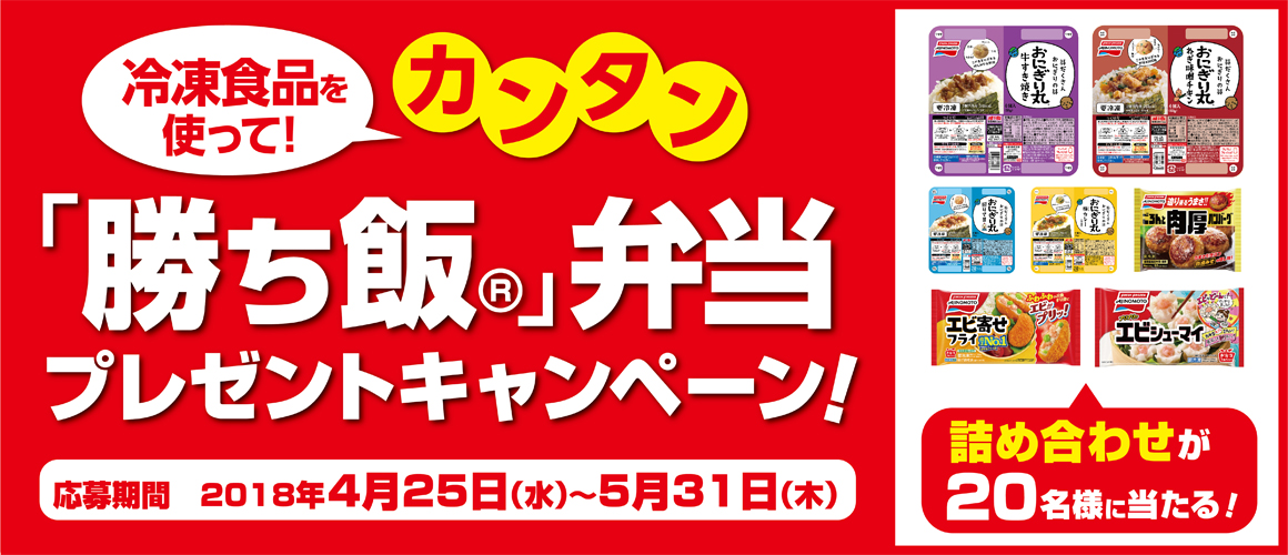 「ザ★チャーハン」、「やわらか若鶏から揚げ ボリュームパック」、「『おにぎり丸®』照りマヨ」、「『おにぎり丸®』牛すき焼き」、「『おにぎり丸®』鶏の梅あえ」の5品をセットにして20名様