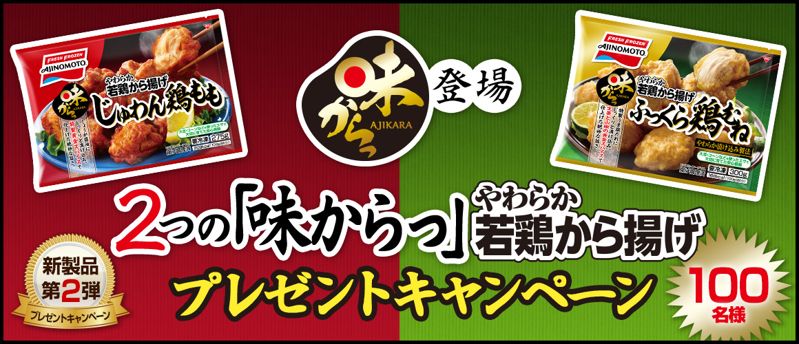 「味からっ」やわらか若鶏から揚げなどを抽選で100名様にプレゼントいたします。
