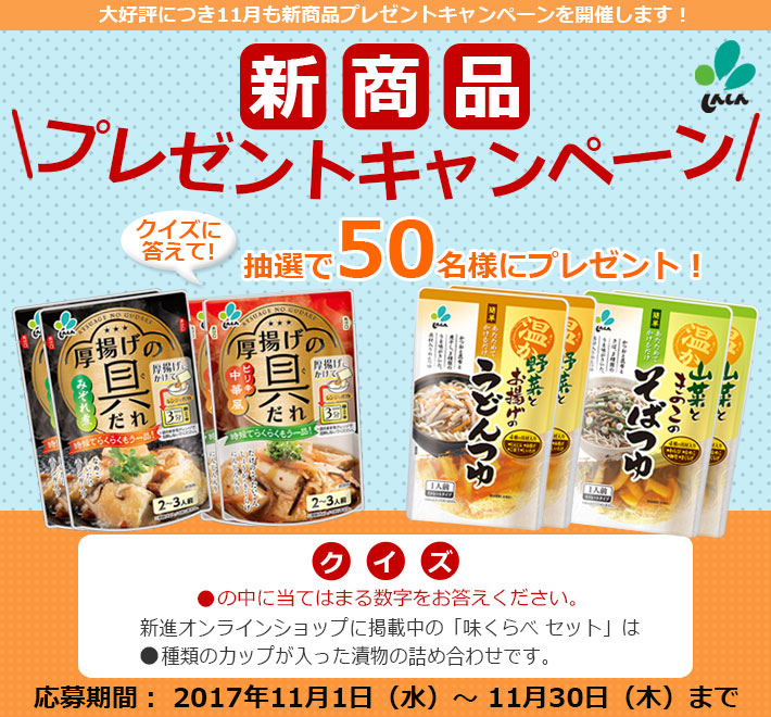 新進 新商品の詰め合わせを抽選で50名様にプレゼントします。