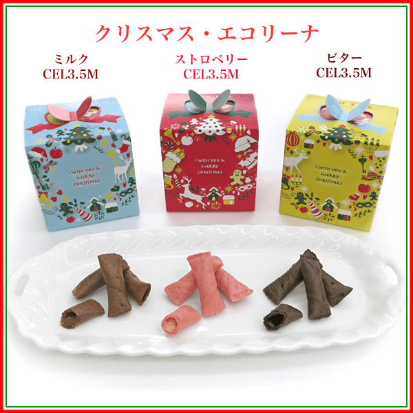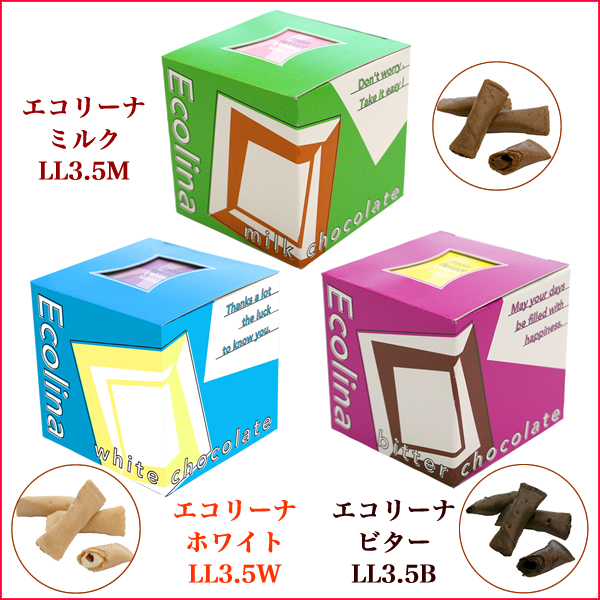 エコリーナストロベリーにはストロベリーチョコ、エコリーナキャラメルにはキュアラメル風味チョコ、エコリーナチーズにはチーズ風味チョコを入れました。