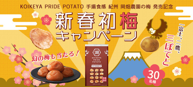 新商品「KOIKEYA PRIDE POTATO 手揚食感 紀州 岡畑農園の梅」と「岡畑農園 幻の梅」をセットにして30名様にプレゼントします!