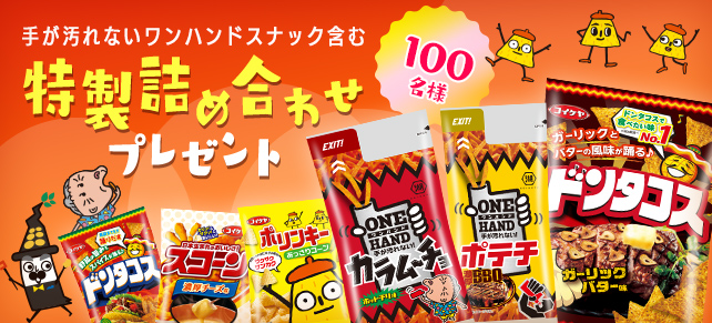 手が汚れないワンハンドスナック含む特製詰め合わせを抽選で100名様にプレゼントいたします。