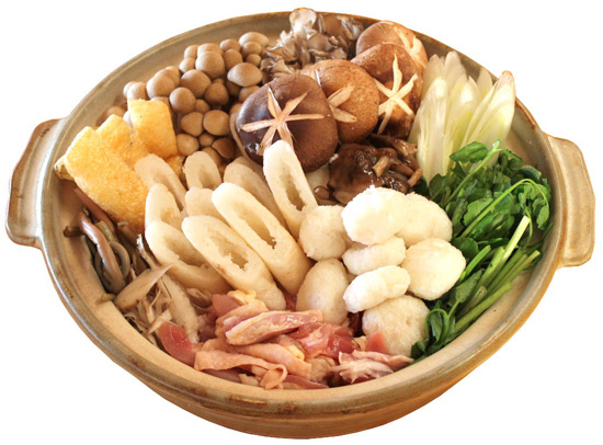 日本三大地鶏の一つである比内地鶏や、炊きたての「あきたこまち」のキリタンポ、山の芋だんご、マイタケ、モタシのほか、地取り野菜などが入った、具たくさんの鍋です。