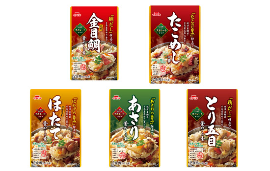 「ストレート釜めしの素」は、水を加えないストレートタイプなので、だしのおいしさがそのまま味わえます。素材のうま味にこだわっただしスープと、ボリュームのある具材が入った釜めしの素です