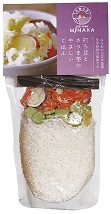 「打ち豆」とは大豆を潰して乾燥させたもの。県産米と自家製打ち豆、野菜をブレンドし、一食分パックしました。