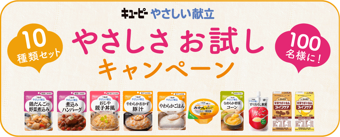 「やさしい献立」と少量で高カロリーを摂取したい方におすすめの「ジャネフ 栄養サポート食品ファインケア」の10品をセットにしてプレゼントいたします。
