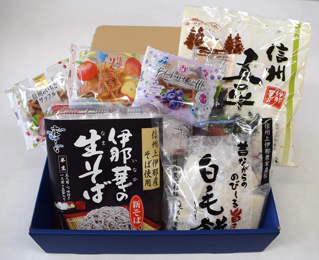 年越しにうれしいお餅やそば、郷土料理の五平餅、上伊那産小麦の生地に上伊那産果物のセミドライフルーツをたっぷり詰め込んだベルギーワッフルを特別にセットにしてお届けします。